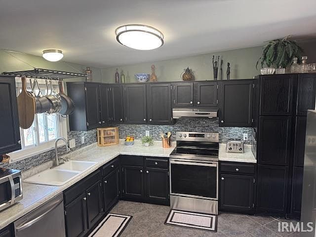 The updated kitchen combines functionality with style, featuring dark cabinetry providing ample storage and modern stainless steel appliances. The decorative backsplash adds visual interest, while the practical layout makes meal preparation efficient. Natural light streams in through well-placed windows, making this kitchen a pleasant space for daily cooking.